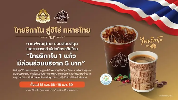 ร่วมส่งกำลังใจและสนับสนุนเหล่าทหารกล้า ผ่านมูลนิธิโรงพยาบาลพระมงกุฎเกล้าในพระราชูปถัมภ์สมเด็จพระเทพรัตนราชสุดา ฯ สยามบรมราชกุมารี โดยทุกการสั่งซื้อเมนู “ไทยการิโน” ทั้งชนิดร้อนและเย็นจำนวน 1 แก้ว จะมีส่วนร่วมในการบริจาคเงินจำนวน 5 บาท เพื่อสนับสนุนการรักษาพยาบาลผู้ป่วยทหารที่ได้รับบาดเจ็บจากเหตุการณ์ปะทะพื้นที่ชายแดนไทย – กัมพูชา ในการปฏิบัติหน้าที่ป้องกันประเทศ ตั้งแต่วันที่ 18 ธันวาคม 2568 - 18 มกราคม 2569 ที่ร้านกาแฟพันธุ์ไทยทุกสาขาทั่วประเทศ เดลิเวอรีไม่ร่วมรายการ